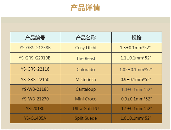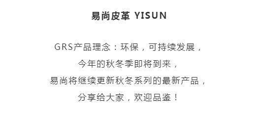 易尚引领时尚,产品应用于鞋子、手袋、箱包、装饰袋、时装、沙发、帽类、珠宝盒、皮带等。是目前国内最具专业性,种类齐全、实力雄厚的皮革生产商之一,GRS认证,主要产品为水性PU,湿法PU、干法PU,PU压花革,套印革,磨皮革,金属贴膜革,擦焦革、疯马革系列等。